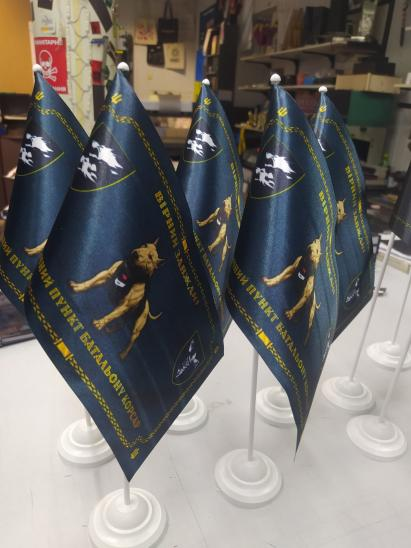 Розмір прапорця: 24х12см, надрукований на атласі і прошитий для закріплення на палочці.